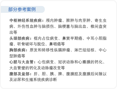 神經(jīng)系統(tǒng):顯示腦干、幕下區(qū)、枕大孔區(qū)、脊髓與椎間盤結(jié)構(gòu);可用于腦脫髓鞘疾病、多發(fā)性硬化、腦梗塞、腦與脊髓腫瘤、血腫、脊髓先天異常與脊髓空洞癥的診斷 縱膈腫瘤、肺門淋巴結(jié)與中心型肺癌的診斷病變診斷 心臟大血管形態(tài)學與動力學無創(chuàng)傷檢查 腹部與盆部器官(肝、腎、膀胱、前列腺和子宮),頸部和乳腺